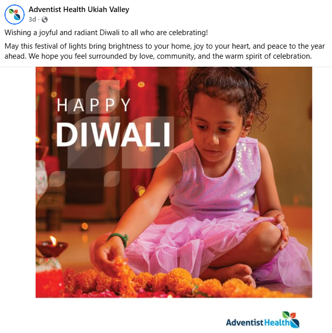 The Adventist Health Ukiah Valley (a Seventh-day Adventist nonprofit organization) is endorsing the Hindu festival of Diwali on it’s recent Facebook post. This is not merely a cultural observation; it is a clear example of the SDA’s slide toward apostasy.